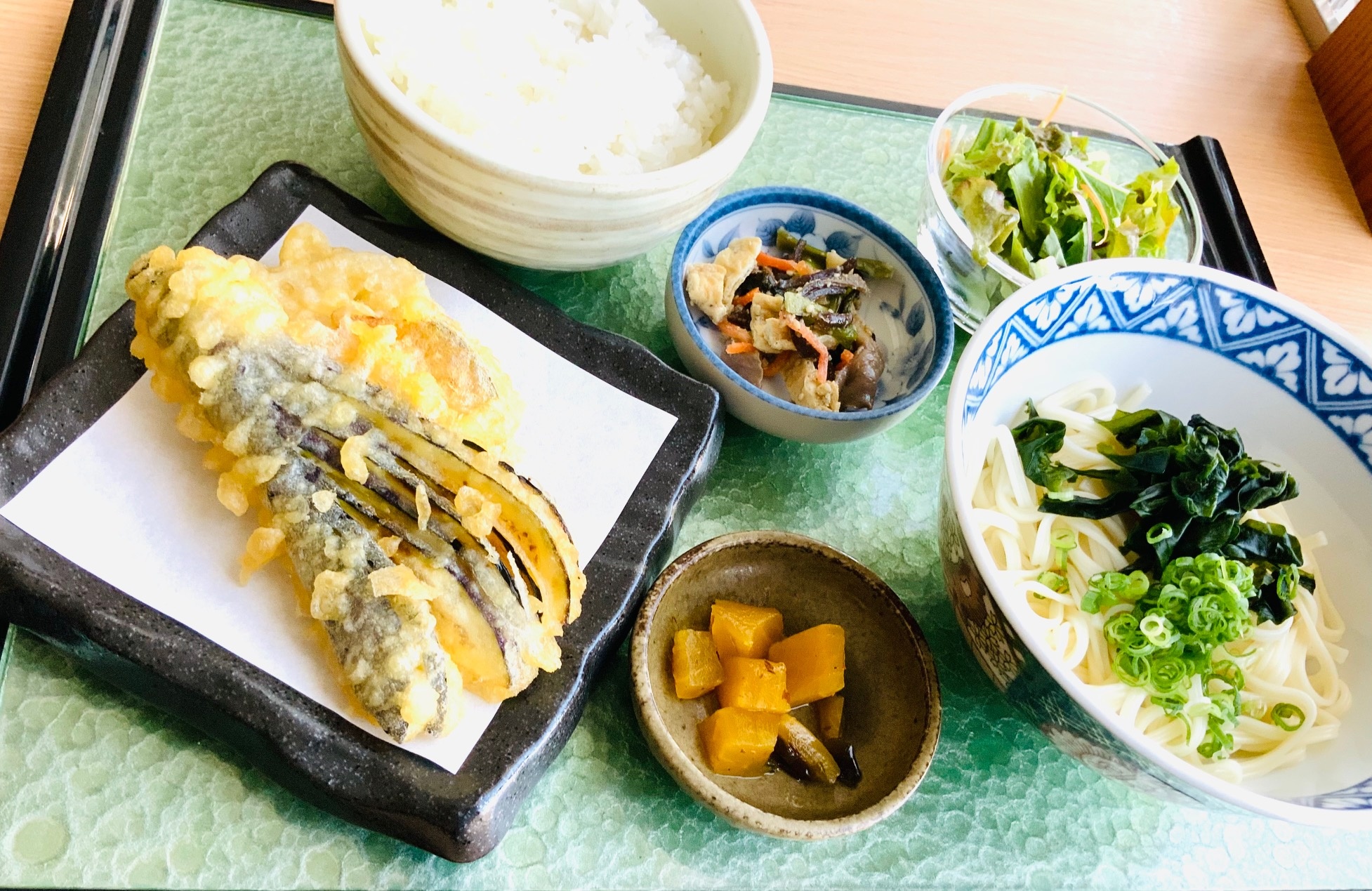 本日のタイムランチメニューは、『細うどん 秋茄子と野菜の天婦羅』です。